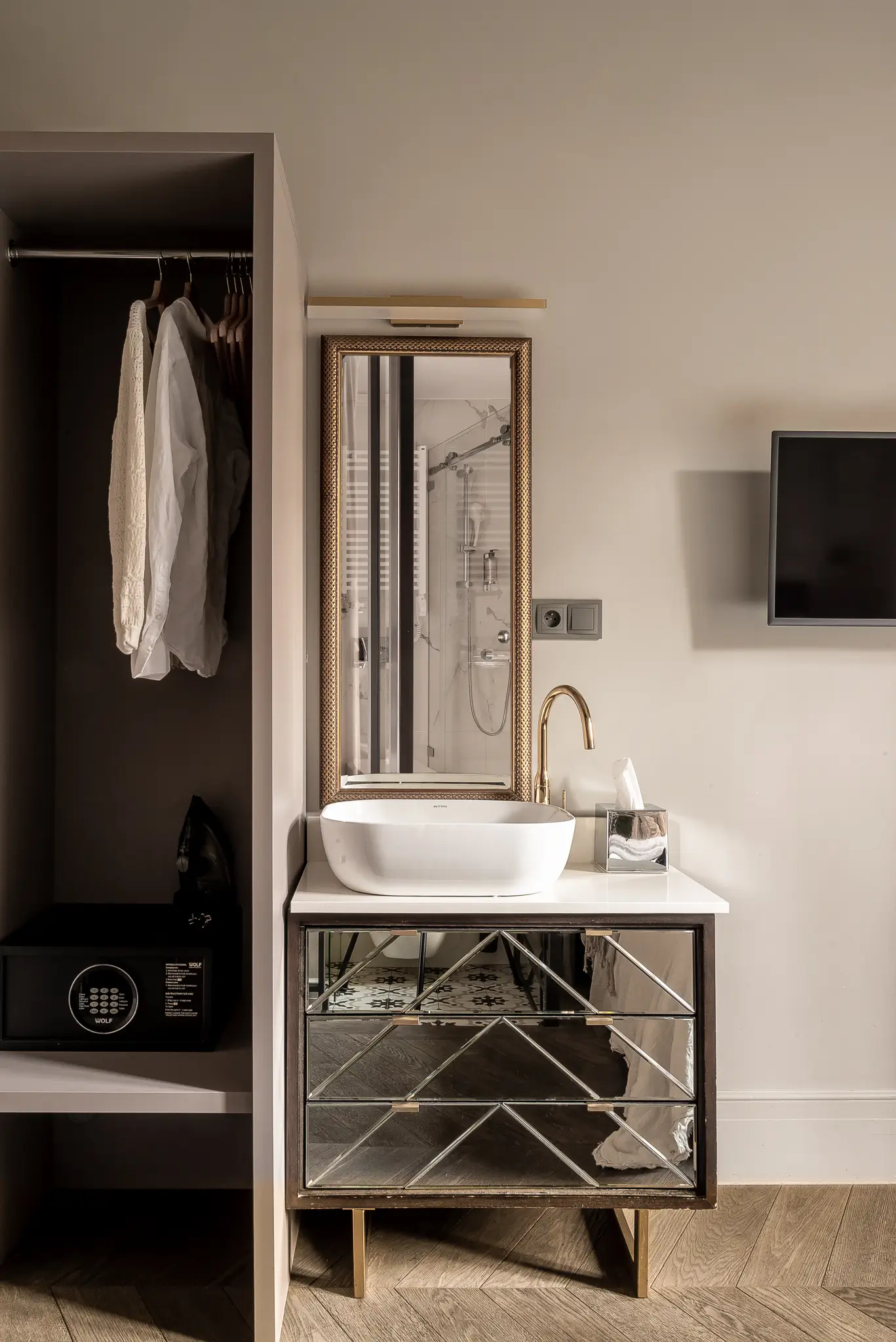 W apartamencie znajduje się część wypoczynkowa z telewizorem, przeszklona łazienka z prysznicem, zestaw kosmetyków, świeże ręczniki oraz suszarka do włosów. Do dyspozycji gości jest również lodówka, czajnik, ekspres do kawy oraz podstawowy zestaw do przygotowania napojów.