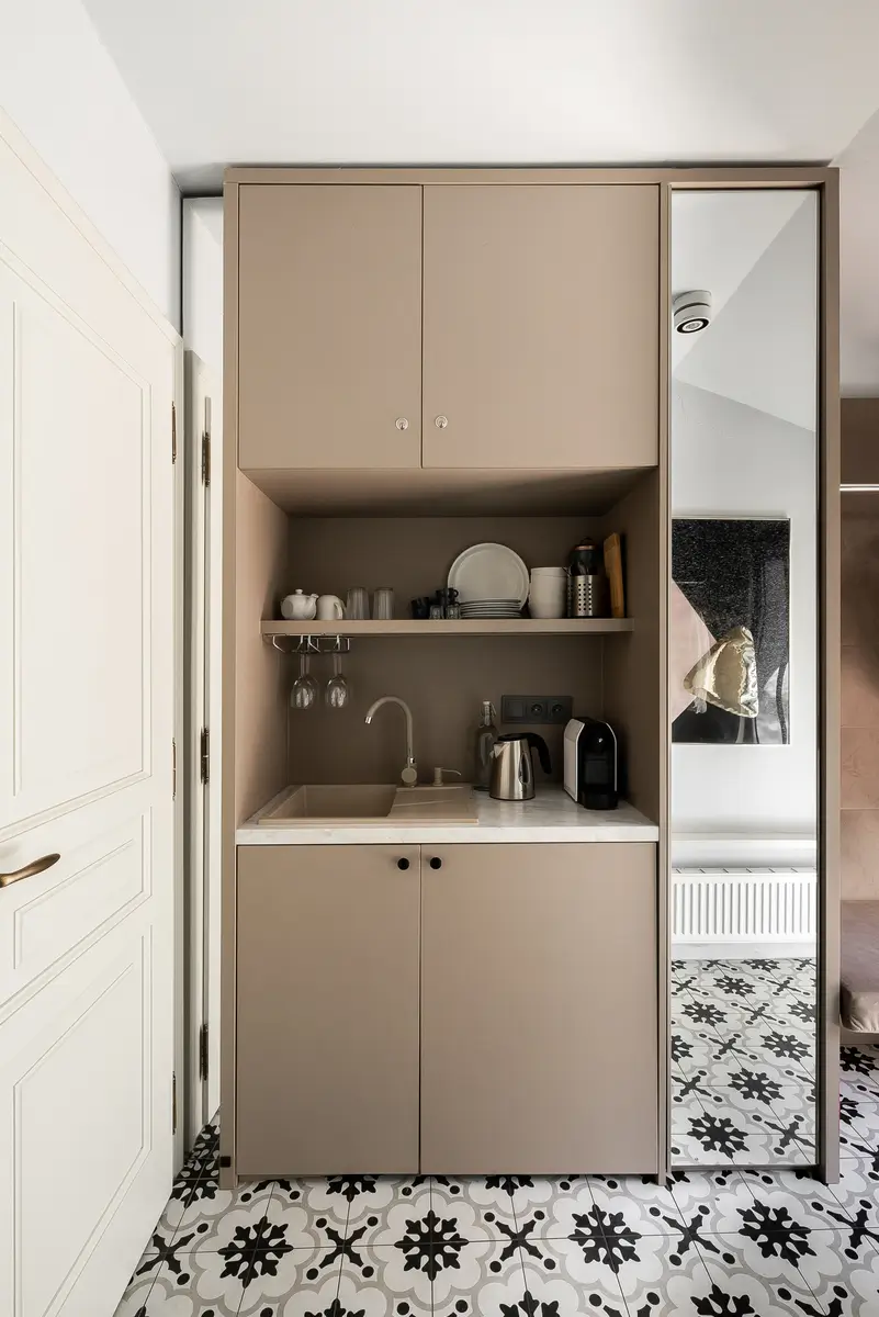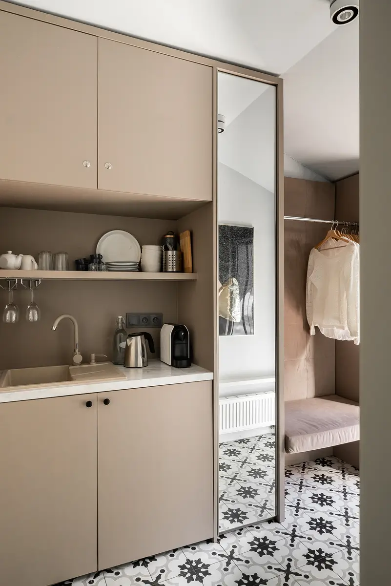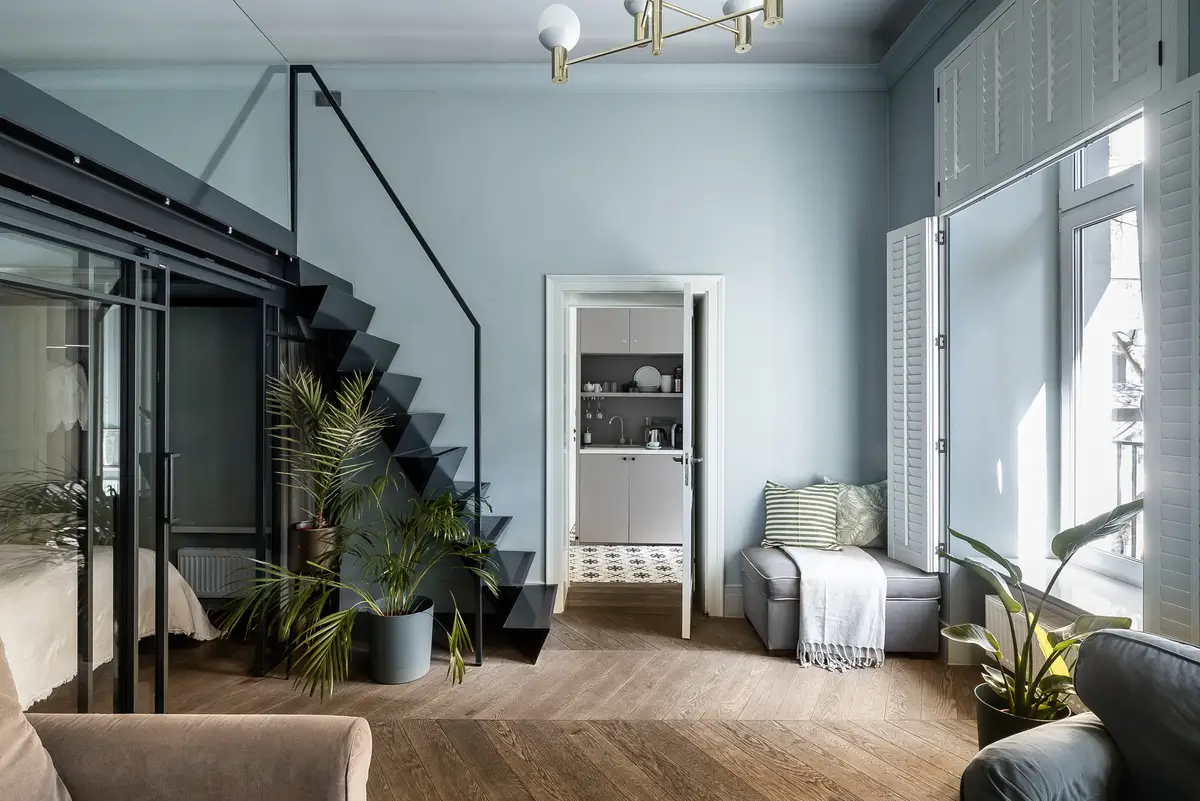 W części wypoczynkowej znajduje się sofa, fotel, pufa oraz szerokie parapety, na których można wygodnie usiąść i podziwiać zielone podwórze. Mini kuchnia wyposażona jest w lodówkę, czajnik, zestaw naczyń oraz ekspres do kawy. Kuchenka indukcyjna dostępna jest na życzenie.